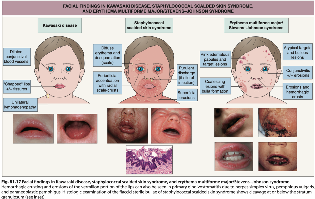 Compare and contrast the skin and eye examination findings in Kawasakis Disease vs SSSS vs EM