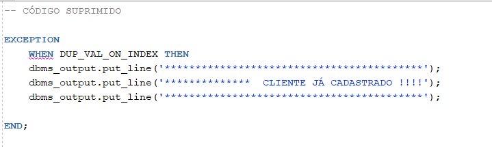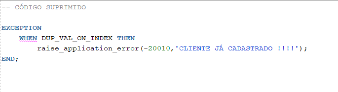 Especifica que o bloco de código seguinte será executado apenas quando ocorrer a exceção DUP_VAL_ON_INDEX, que indica a tentativa de inserir um valor duplicado em uma coluna com restrição de unicidade.
