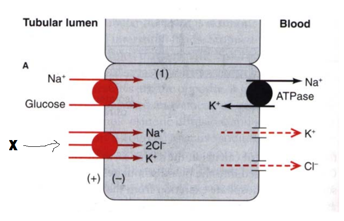 The schematic diagram below shows a model of epithelial transport in the kidney proximal tubule. The cell is at rest with typical ion concentrations in the extracellular and intracellular solutions. The membrane transport protein labelled “X”, which transports Na+, K+, and Cl- into the cell as shown, is an example of a: