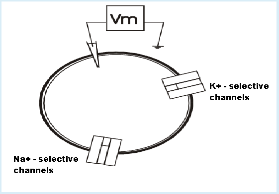 The diagram below shows a schematic nerve cell bathed in intracellular and extracellular solutions at 37C and with the concentrations of Na+ and K+ as shown. The cell membrane contains a population of K+ selective ion channels and a separate population of Na+ selective ion channels as indicated. An electrode is inserted into the cell that measures the membrane potential (Vm). The Nerst equation for ion x at 37C, can be simlified to: Ex=62mVlog10([ionoutside]/[ioninside].