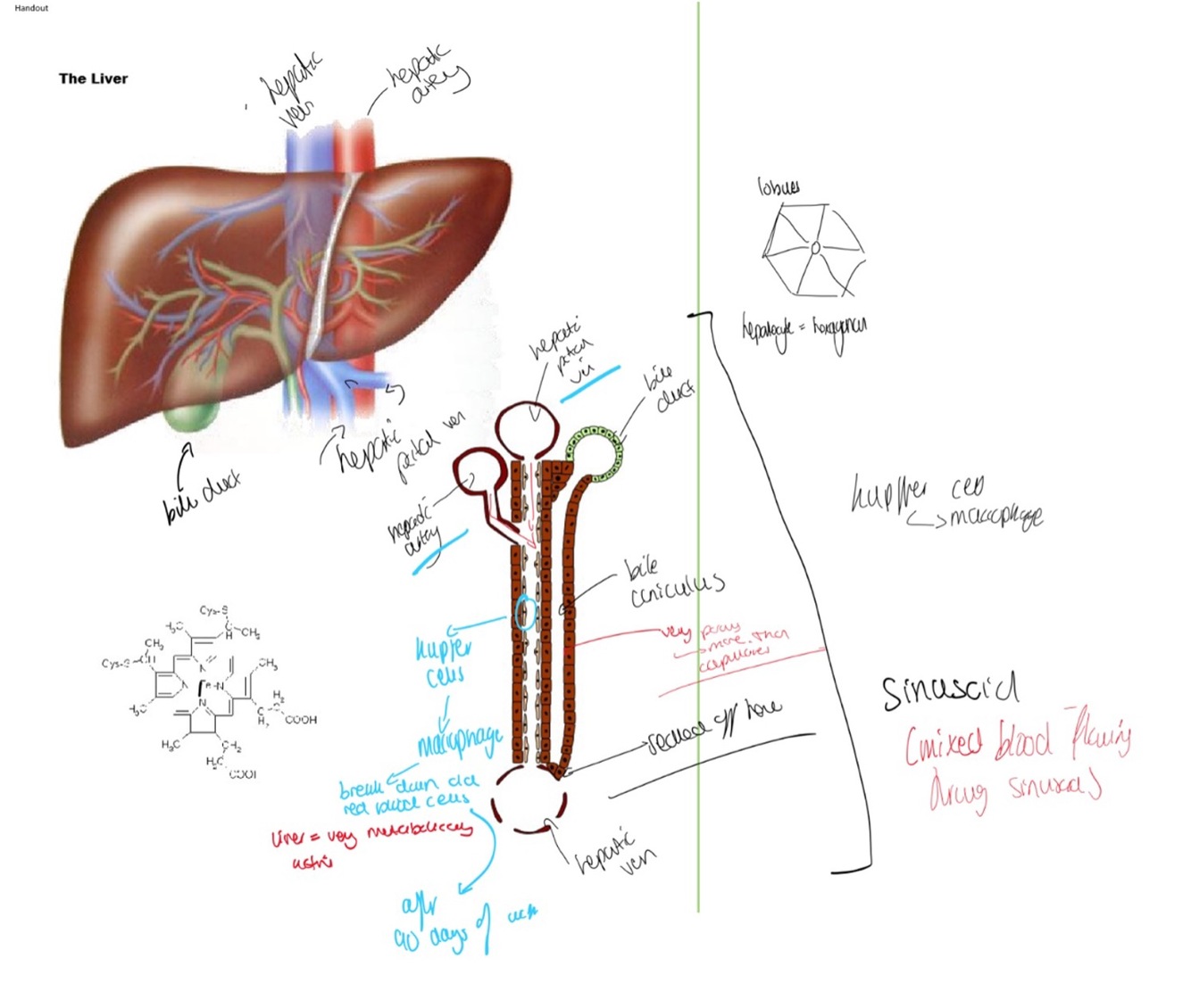 liver has lobes (right, left) + lobules with hepatocytes arranged radially.