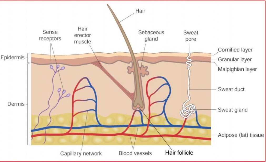 In cold conditions erector muscles contract and hairs stand up (piloerection) to create a layer of heat , blood vessels close , brain causes shivering to produce heat