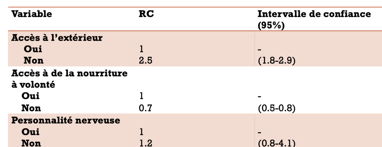 § Accès à de la nourriture à volonté: Biais de désirabilité sociale possible, surreprésenté chez les propriétaires d’animaux obèses. Biais de mauvaise classification possible.