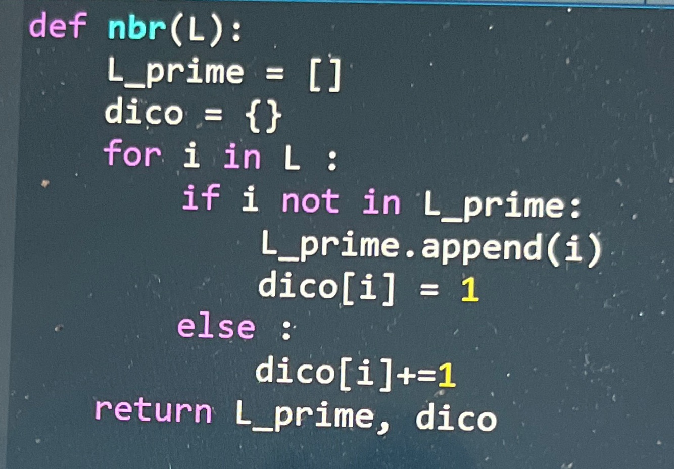 On veut un algorithme qui a une liste renvoie la liste des éléments de la liste originale dont les éléments n’apparaissent qu’une fois et le nombre d’occurence de chacun de ces éléments dans la liste d’origine