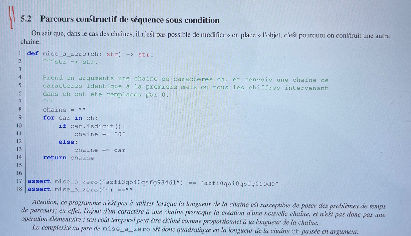 Créer une fonction mise_a_zero(ch) qui prend en argument une chaîne de caractères et renvoie une chaîne identique ou tous les chiffres ont été remplacés par 0. Quelle est au pire sa complexité ?