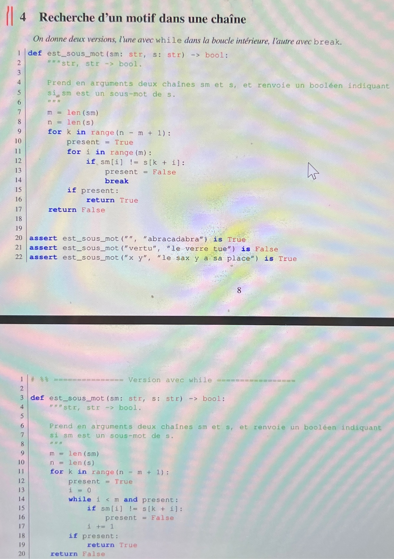 Créer une fonction est_sous_mot qui prend en arguments deux chaînes s et sm et renvoie un bouleen indiquant si sm est un sous mot de s. On fera deux versions, une avec break et une avec while