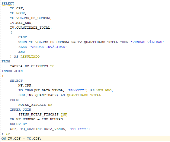 Adicione um campo à consulta anterior que utilize a função CASE para determinar se as vendas são válidas ou inválidas, com base na comparação entre o volume de compra do cliente e a quantidade total de itens vendidos por mês.
