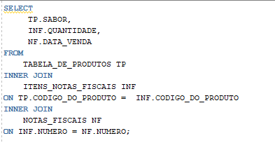 Consulta SQL que combine informações de três tabelas (TABELA_DE_PRODUTOS, ITENS_NOTAS_FISCAIS e NOTAS_FISCAIS) para exibir o sabor dos produtos, a quantidade vendida e a data da venda.