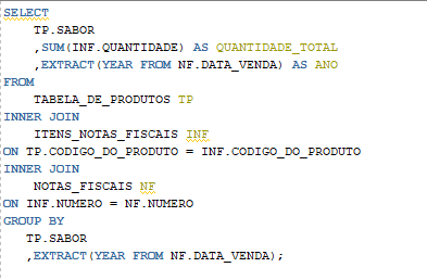 Consulta SQL que combine informações de três tabelas (TABELA_DE_PRODUTOS, ITENS_NOTAS_FISCAIS e NOTAS_FISCAIS) para exibir o sabor dos produtos, a quantidade vendida e agrupando por ano.