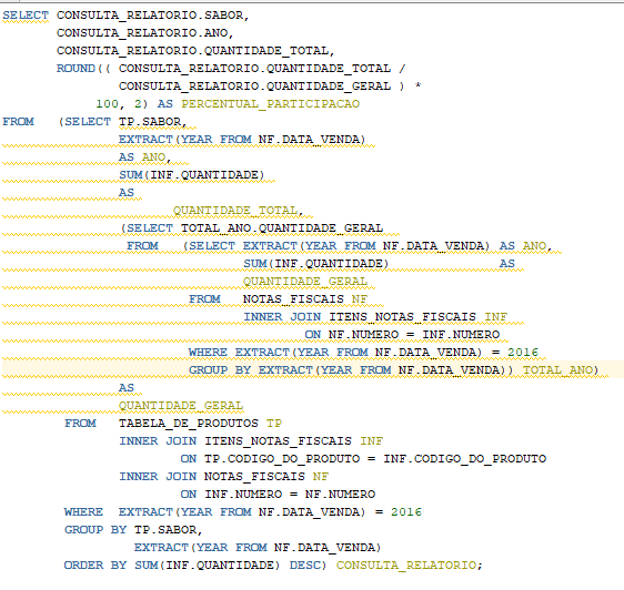 Consulta SQL que combine informações de três tabelas (TABELA_DE_PRODUTOS, ITENS_NOTAS_FISCAIS e NOTAS_FISCAIS) para exibir o sabor dos produtos, a quantidade vendida, agrupando por ano, filtrando apenas o ano de 2016 e calculando o percentual de participação de cada produto.
