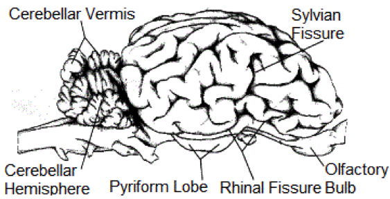 Location: In the lateral view rostral to the pyriform lobe caudal to the olfactory bulb