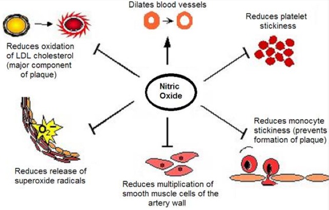 Nitric oxide is produced during exercise. NO dilates blood vessels, makes platelets less sticky, reduces plaque formation, reduces smooth muscle growth in artery walls and reduces ROS release.