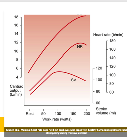 However! SV starts to drop after a while: as HR increases, diastolic time decreases, so get reduced blood out.