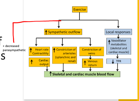 What are the increases in sympathetic outflow that occur due to exercise? [3]
