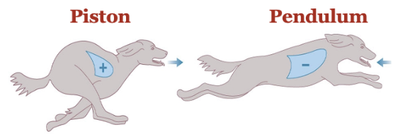 Piston – during stance phase of forelimbs, abdominal contents press on diaphragm, aiding expiration, scapula pressed into chest, compressing rib cage