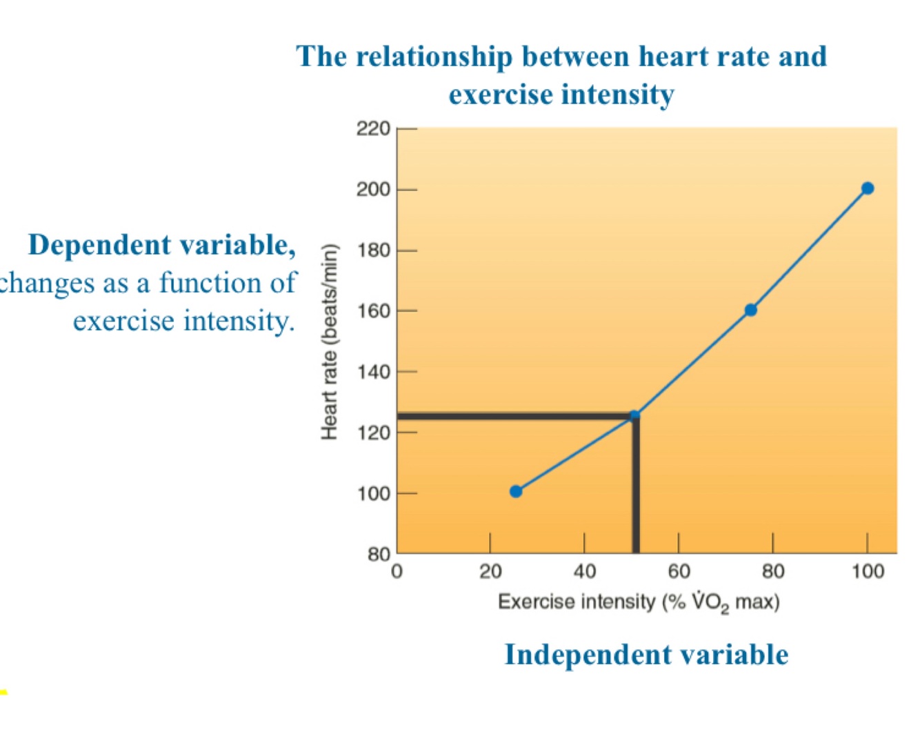 According to the following graph, what is the heart rate of a subject exercising at 50% VO2 max?