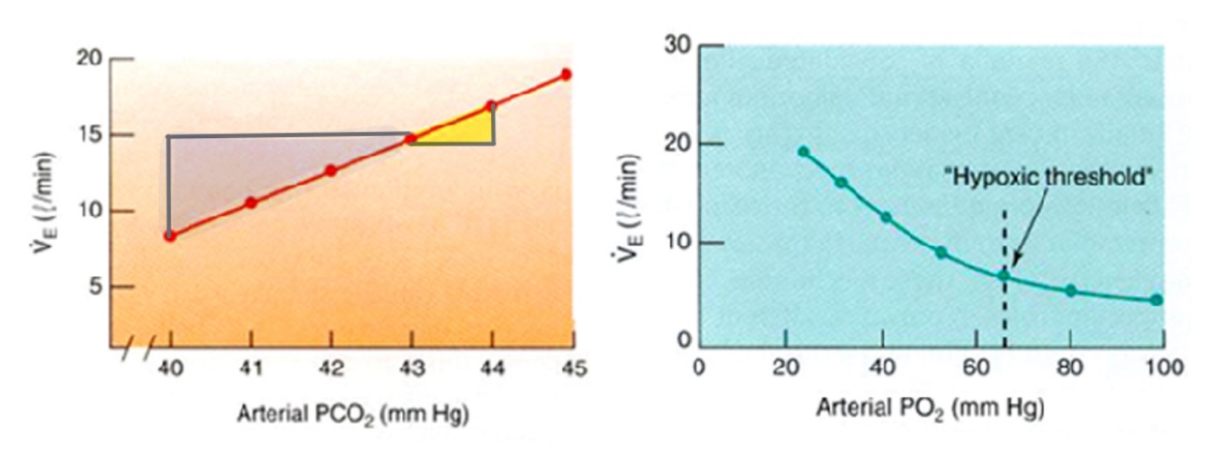 Figures below show graphs of minute ventilation VE (l/min) against arterial PCO2 and PO2.