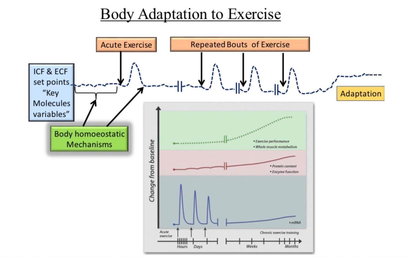 Chronic adaptation: a physiological change that occurs when the body is exposed to repeated exercise bouts over a period of weeks or months.