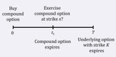 At time 0, you purchase an option expiring at time t1 that allows you to buy or sell another option that expires at time T for strike price x.