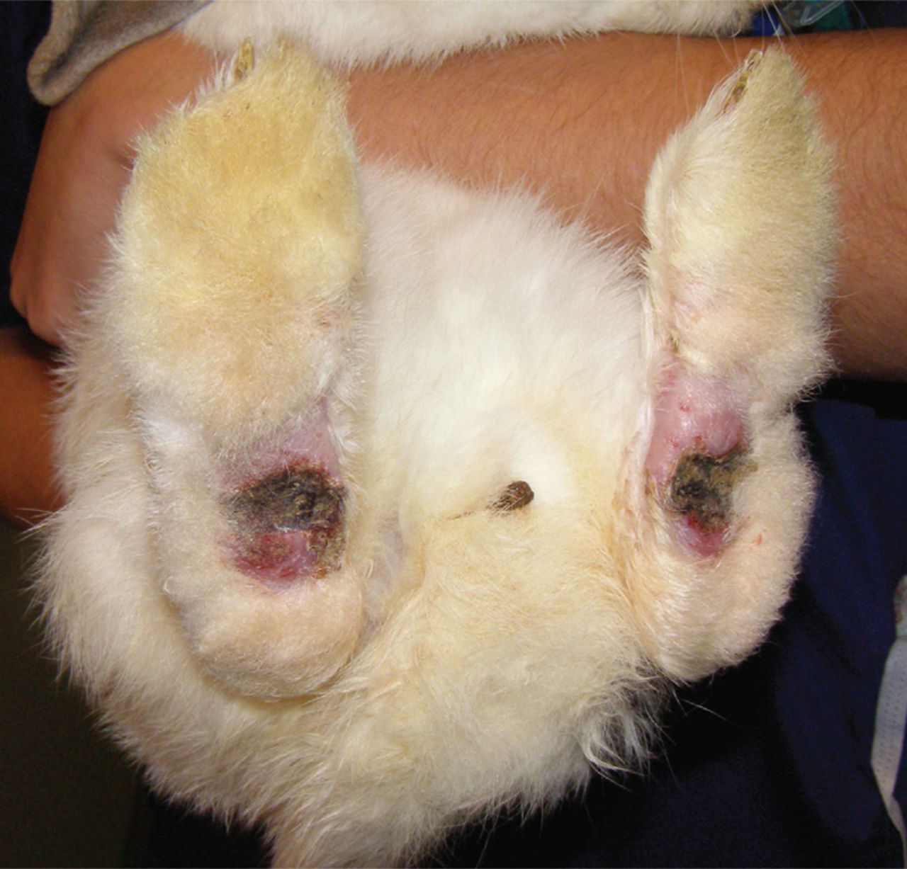 A pet rabbit presents to you for mild dermatitis. On physical exam, you note a scaly dermatosis with areas of thinning on the dorsum. What is the most likely etiology?