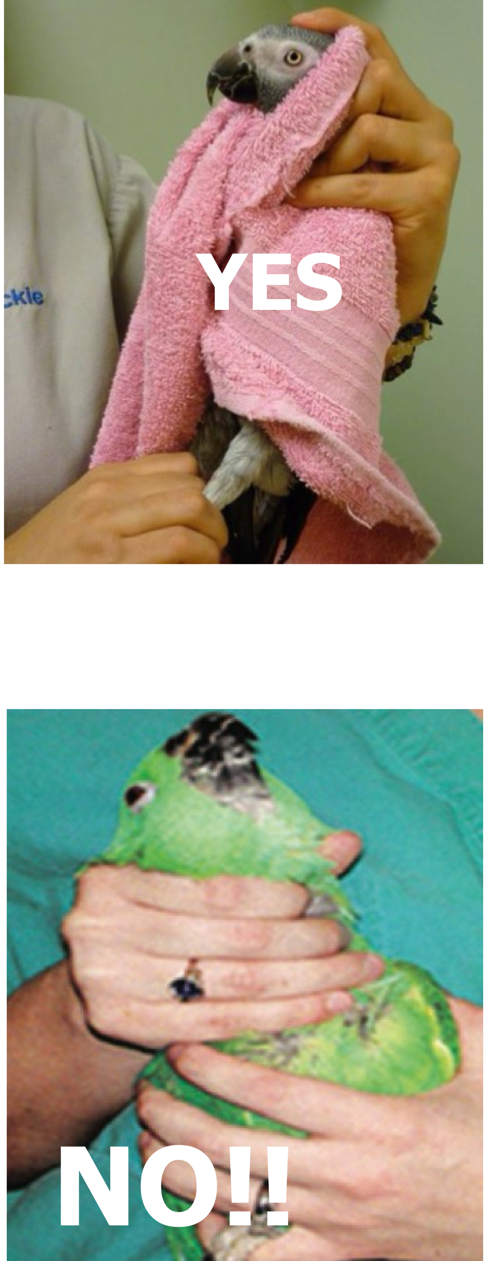 How are birds properly restrained? What 3 things are avoided?