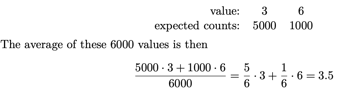 Example 1. Suppose we have a six-sided die marked with five 5 3’s and one 6. (This was the red one from our non-transitive dice.) What would you expect the average of 6000 rolls to be?