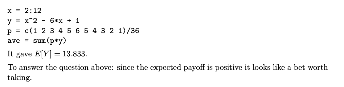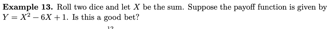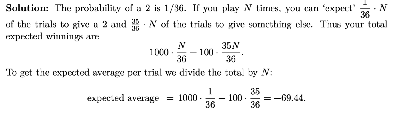Example 2: We roll two standard 6-sided dice. You win $1000 if the sum is 2 and lose $100 otherwise. How much do you expect to win on average per trial?