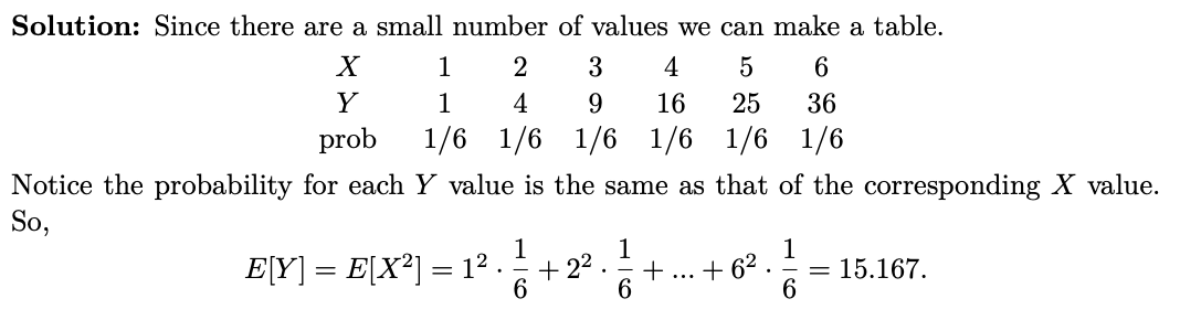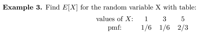 Since there are five 3’s and one six we expect roughly 5/6 of the rolls will give 3 and 1/6 will give 6. Assuming this to be exactly true, we have the following table of values and counts (see fig)