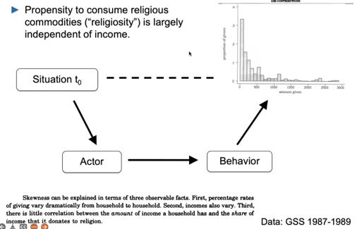 Iannaconne analyzes isolated household decisions like church attendance, financial contributions (consciously disregarding interactions & equilibria - there is no strategic interaction in the manner of “I’m not donating bc my neighbors already give so much”