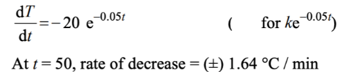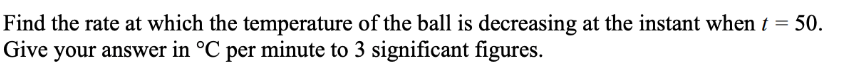 Find the rate at which the temperature of the ball is decreasing at the instant when t=50. Give your answer in celsius per minute