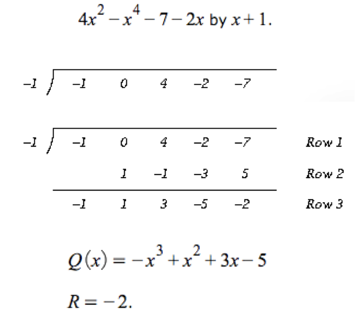 The final entry in row three is the remainder, and the others are the oefficients of a polynomial whose degree is one less than the dividend.