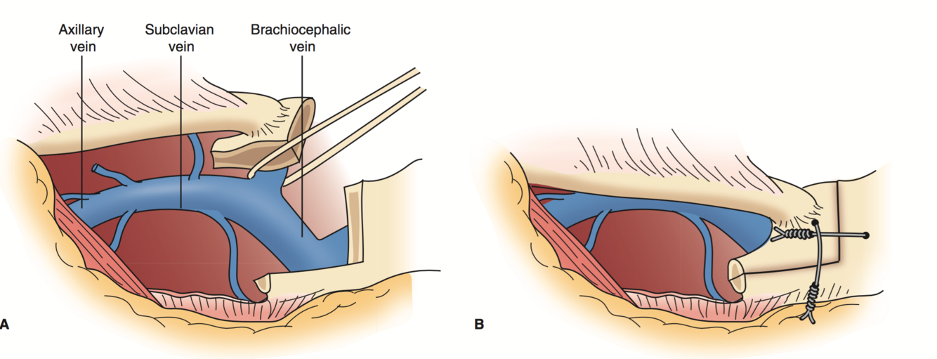 Molina et al described - supraclavicular approach, 1st rib resection, median sternotomy of 1st interpsace leaving sternoclavicular joint intact, close at end with 2 sternal wires at 90 degrees.