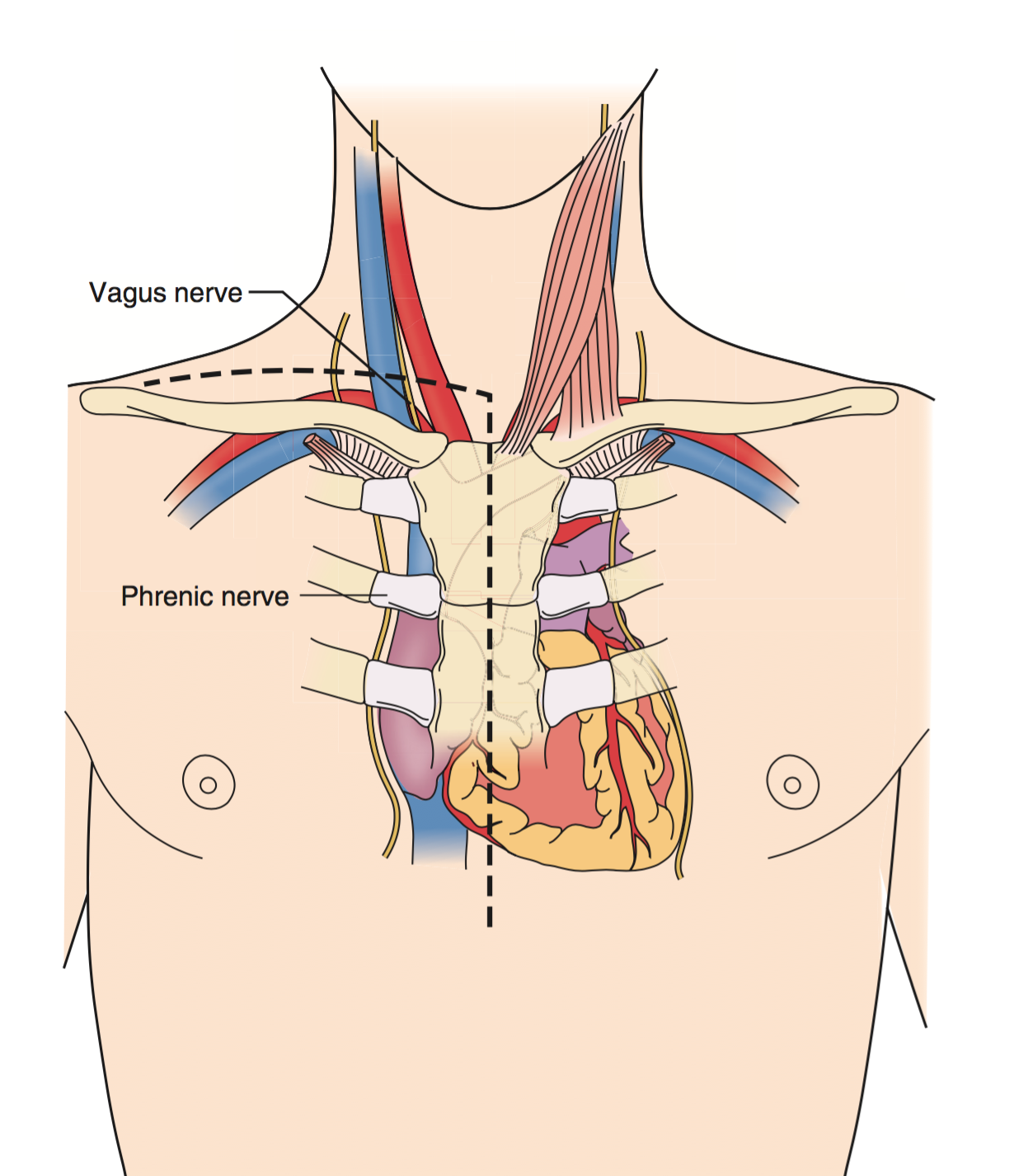 In a median sternotomy - which 2 nerves do you have to be careful to preserve during the superficial dissection? What are their courses?