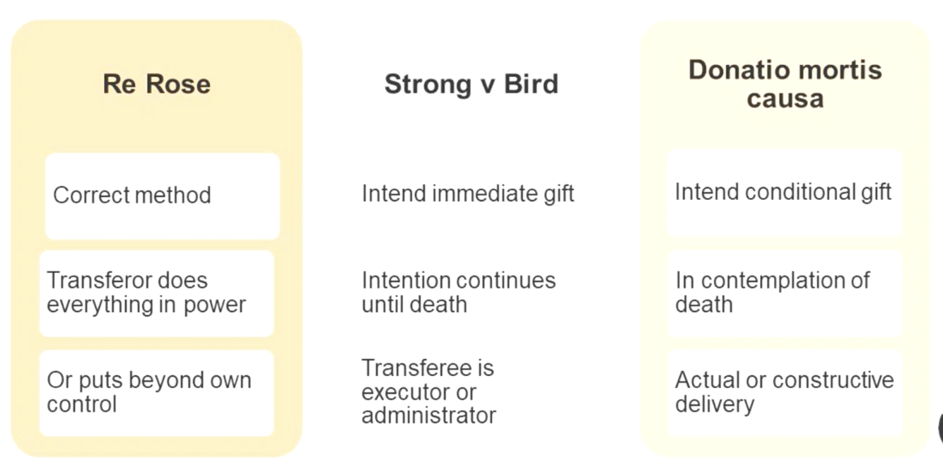 Re Rose - two transfers of share executed by Mr Rose on 30 March (one by gift to wife and other to Ts to be held on trust for wife and son) - had to be effected before 10 April if estate duty to be avoided on Mr Rose’s death 4 years later - transfers and share certificates delivered to company registrar but not registered until 30 June meaning legal title passed then (after 10 April). Was held that no estate duty payable because transfers effective in equity when Mr Rose delivered correct transfer documentation to Registrar before crucial date of 10 April = Mr Rose held legal title on constructive trust for recipients (pending registration of legal title) so as Bs they could force the transfer of legal title to them