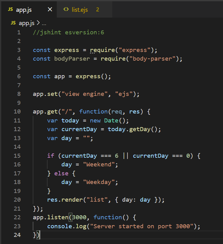 The file will perform calcualtions and then the server will respond (res) to the browser by rendering (render) a file named “list” (which is in a folder called “views” - nb “view engine”). This list.ejs file will have an embedded tag that allows the res.render to send contingent information to the browser using a key-value pair ({ day : day}).