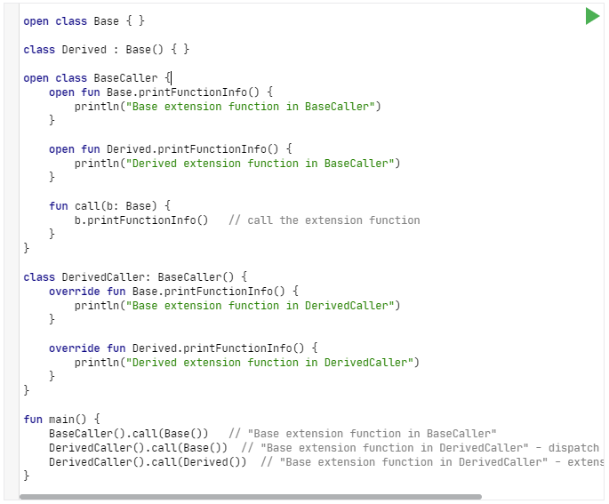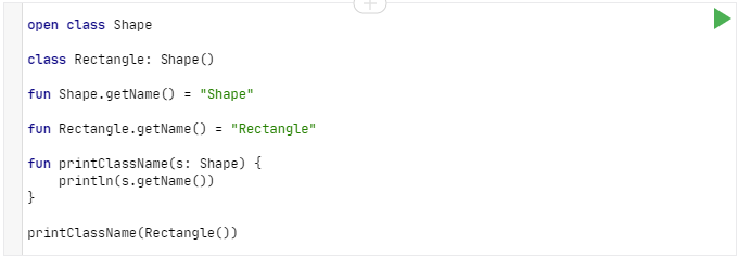 This example prints “Shape”, because the extension function being called depends only on the declared type of the parameter s, which is the Shape class.