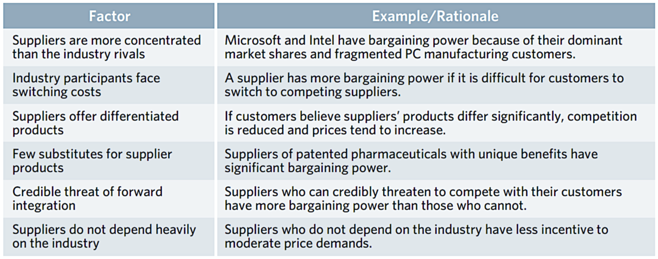 Pressures that industry suppliers can exert on an industry’s profit potential.