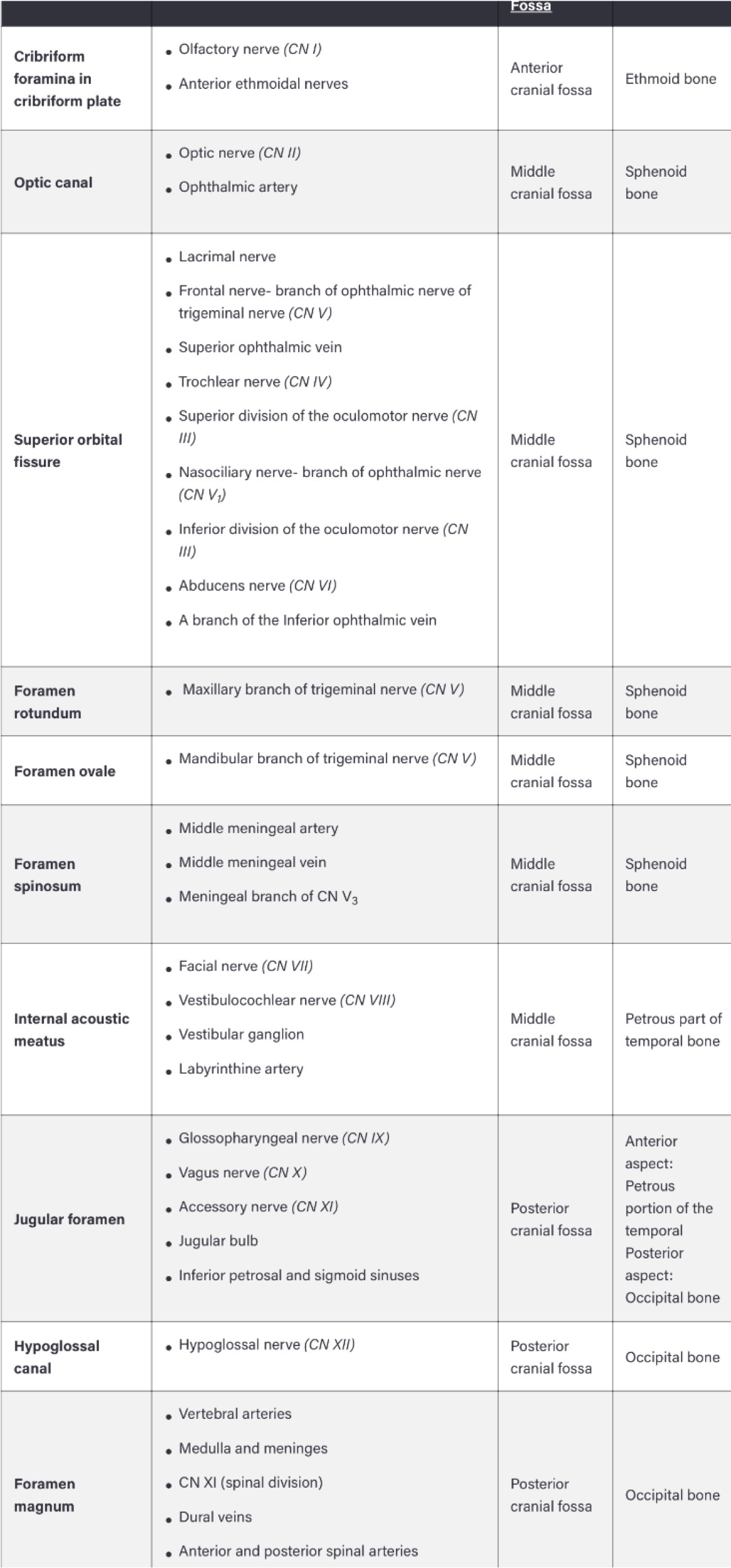 Foramen summary table