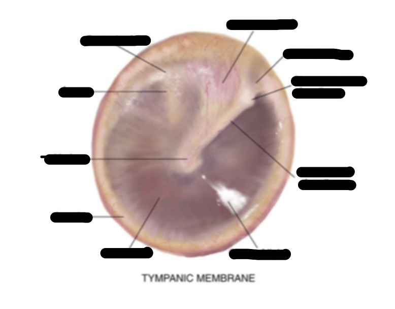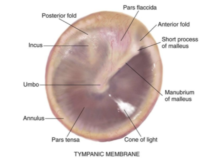 -Umbo: Peak of depression -Manubrium of malleus: One of the tiny bones involved in the transfer of sound -Cone of light -Pars tensa -Pars flaccida