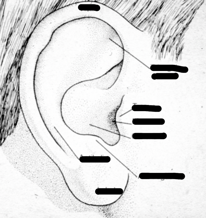 -Ear lobe- does not contain cartilage, only fibrous tissue, fat and blood vessels -Tragus: long projection which covers the EAM