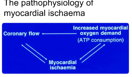 Diagram: if coronary flow doesn’t keep up with increased myocardial oxygen consumption then MI occurs. Vicious cycle - MI leads to increased O2 demand and blood flow.