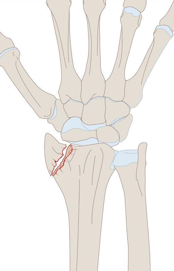 Fratura do rádio distal com traço intra-articular e desvio dorsal.