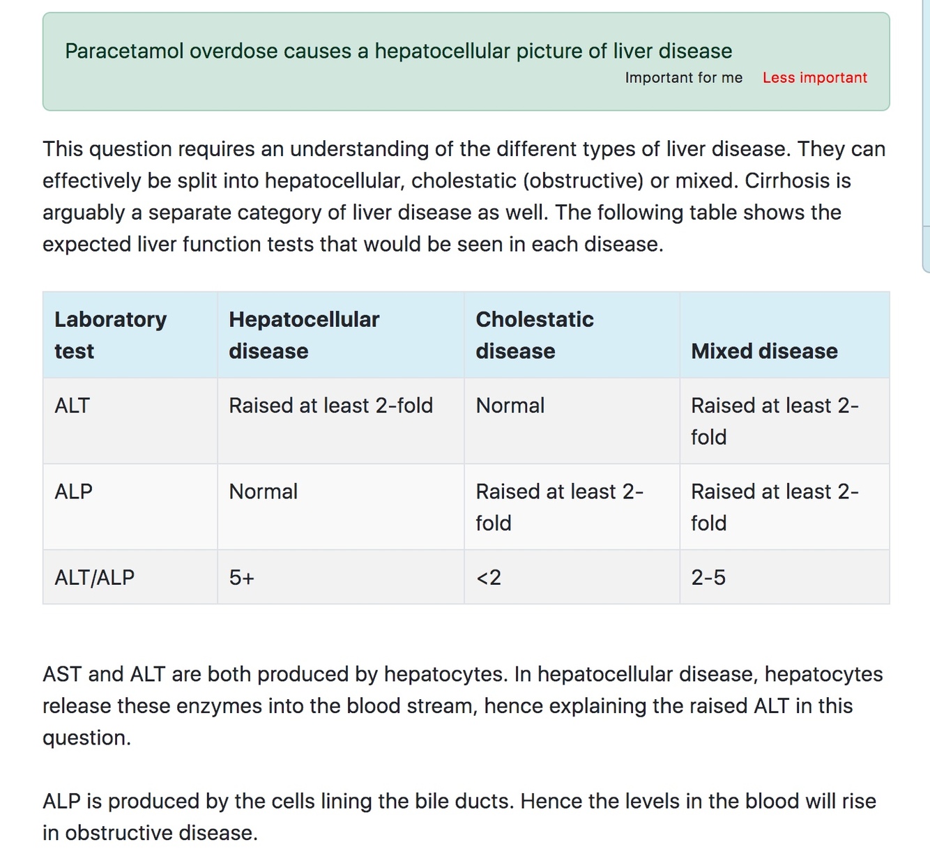 LFTs result difference in hepatocellular vs cholesatic disease and paracetamol overdose