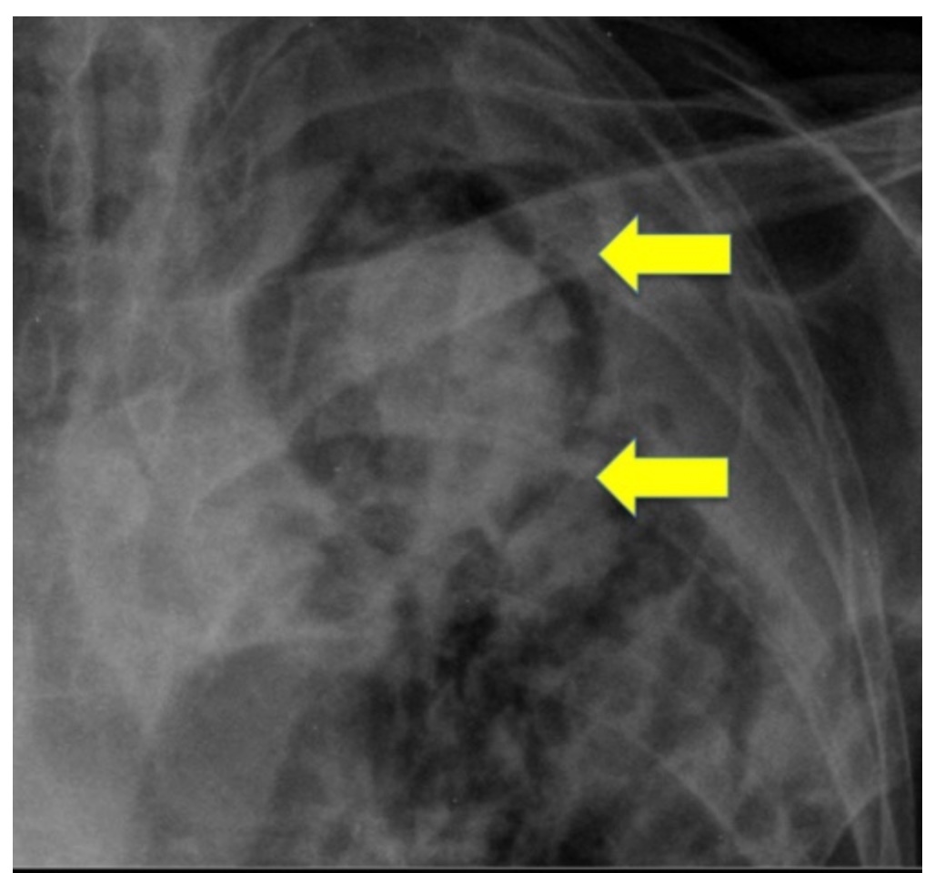 “An X-ray is taken which shows a target-shaped lesion in the right upper lobe with air crescent sign present”