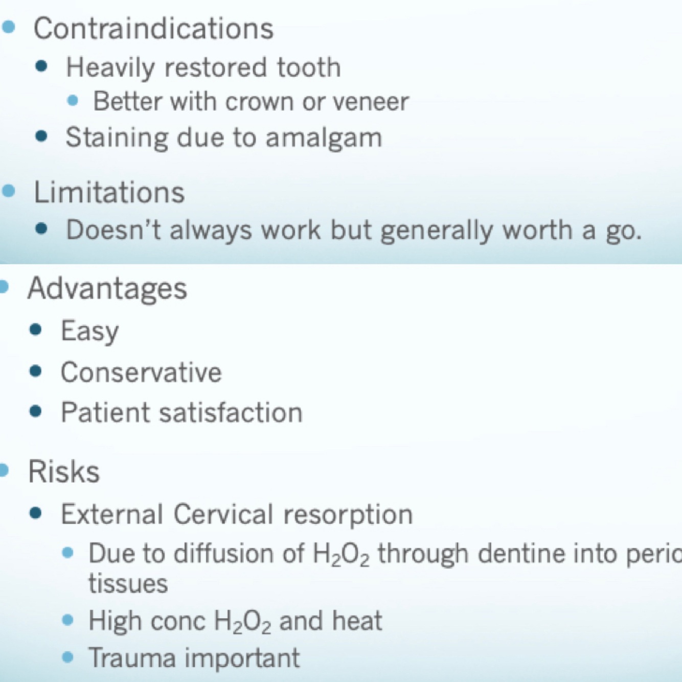 Contraindications / adv / negatives of internal bleaching