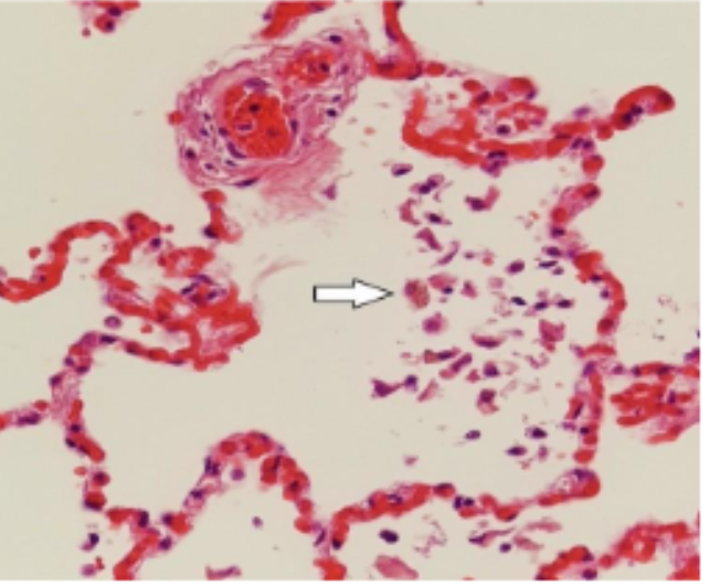 En arteriol som är fyll med röda blodkroppar (vänster, övre hörnet). Alveolerna är utspända, och kapillärer är hyperemiska med röda blodkroppar.Det finns deskvamerade celler i alveolen. Pilen pekar på en hemosiderinfyllda makrofager (”heart failure cells”), som tyder på äldre blödningar i alveolen.Bilden talar för akut och kronisk stas i lungkretsloppet. Ingen ödemvätska ses dock.