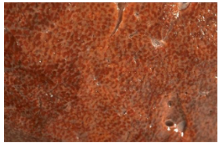 Mönstret kallas för muskot nöt teckning (”nutmeg”). Det beror på en kronisk stas i hjärtat som fortplantas via v. cava och till levervenerna. Fortsatt stas leder till att de centrolobulära delen av leverlobuli (central venerna) får ischemiska skador, medan de hepatiska arteriolerna förhindrar att sådanaischemiska utvecklas periportalt. Vid tillräcklig stas benämns detta som centrilobulär hemorrhagisk nekros, som då uppträder som ”nutmeg” teckning.