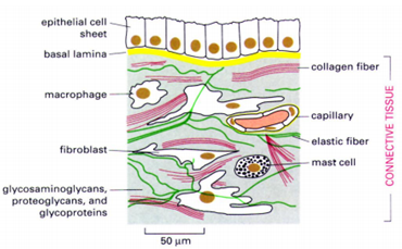Highly elastic connective tissue, and bedding on which small glands and epithelia connect to the basal laminae around cells.