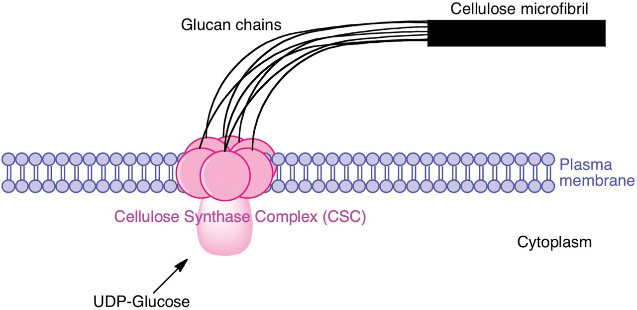 Cellulose is synthesised at the surface of the plasma membrane by multimeric enzymatic terminal complexes – “rosettes”.