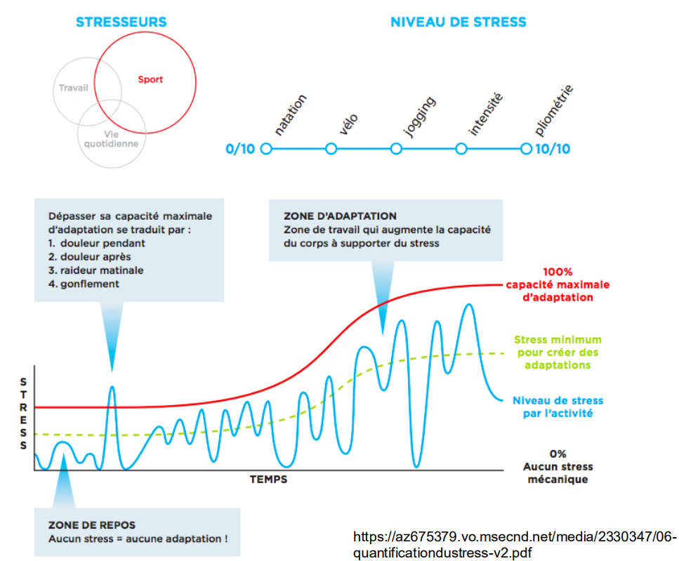 moduler les charges par le repos/rehab progressive/renfo/modalité pour maintenir le stress dans la zone d’adaptation optimale